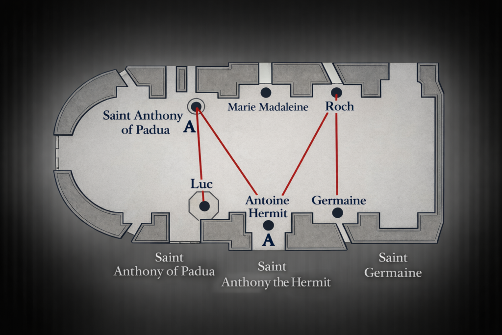 Beyond their individual identities, the spatial disposition of these statues constitutes a central element of the church’s symbolic program. When the initials of the figures positioned around Saint Mary Magdalene are isolated and read according to their arrangement, they form the word “Graal”, while simultaneously outlining the letter “M”, the initial of Maria.