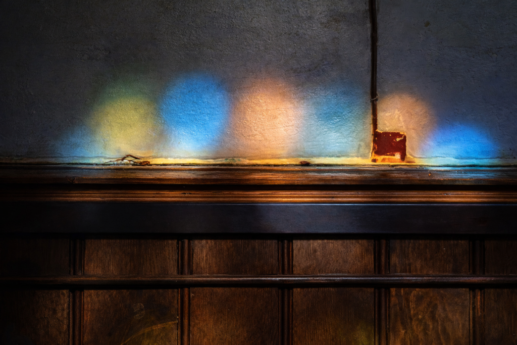 As the Sun rises and advances along its winter trajectory, the light passing through the stained-glass window undergoes selective spectral filtering, producing concentrated blue-toned projections. These projections become visible around 11:00 a.m., reach maximum clarity and intensity near 1:00 p.m., and then gradually dissolve as the Sun’s angle shifts.