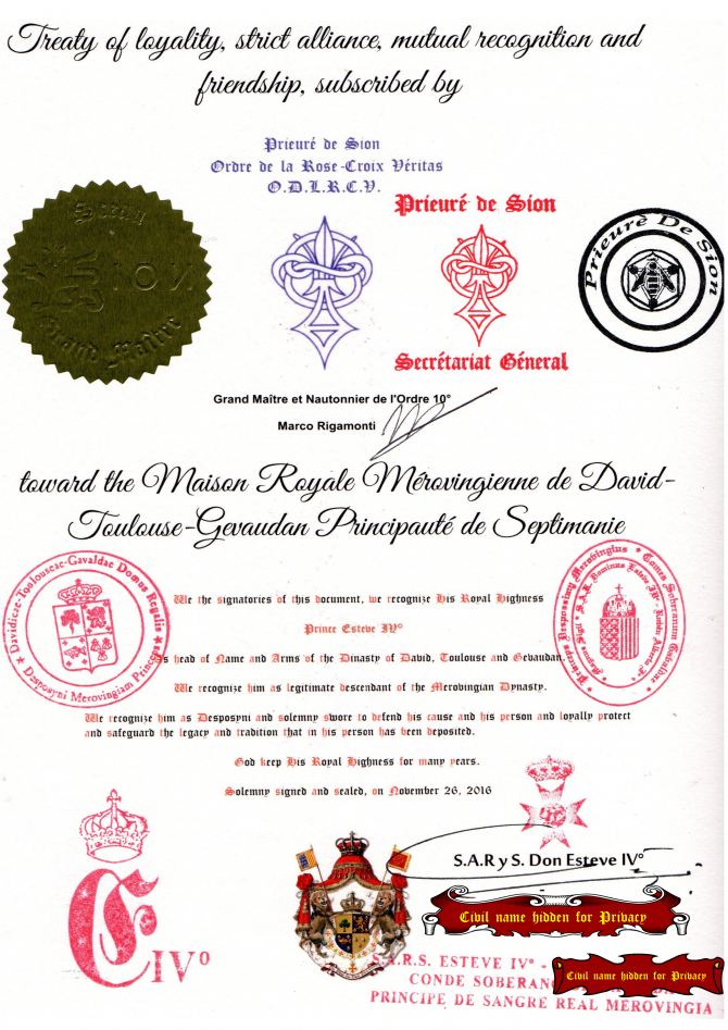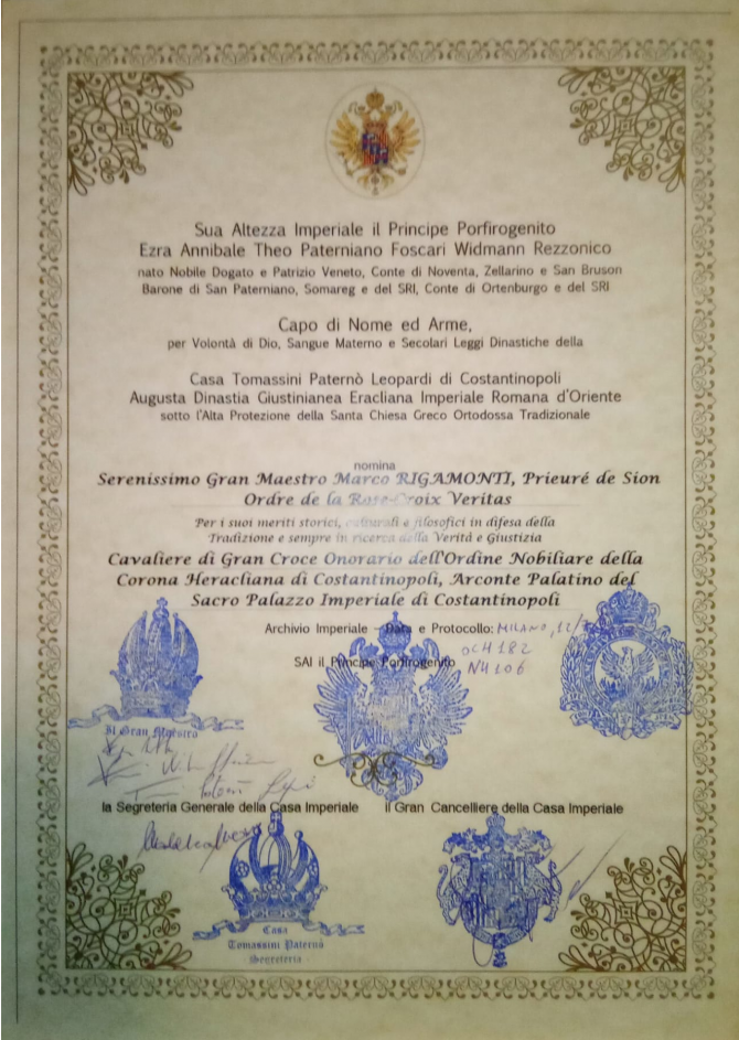 In 2015, the Order was formally re-registered to reaffirm its institutional and chivalric continuity. The Prieuré de Sion – Ordre de la Rose-Croix Véritas (O.D.L.R.C.V.) received the initiatic transmission of the Plantard de Saint-Clair lineage through Gino Sandri, thereby ensuring the lawful succession of the Grand Magisterium and the uninterrupted transmission of the chivalric Tradition.