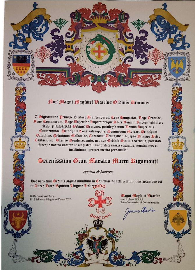 In his capacity as Grand Master, he acts as Custodian of the Tradition, guarantor of initiatic legitimacy, and official representative of the Institution at an international level, upholding the principles of honour, discipline, fidelity, and interior sovereignty that have defined the chivalric vocation across centuries.