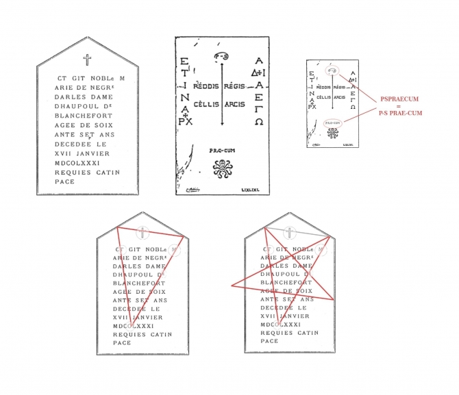 Abbé Bigou is credited with producing both the funerary stele (to the left) and the tomb slab (to the right) of the Marquise of Blanchefort, as well as with creating the famous parchments that contained the crucial knowledge confided to him by the Marquise on her deathbed.